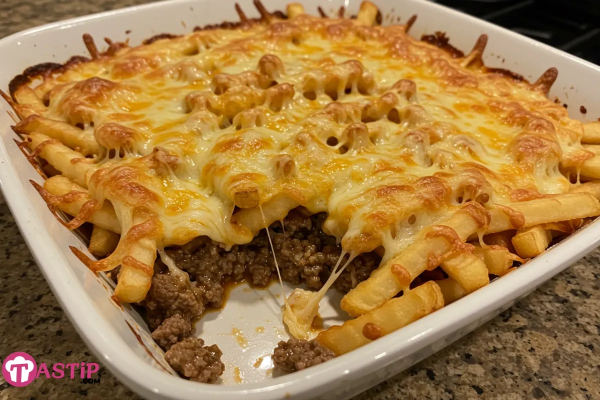 - Bake: Place the dish in the oven and bake uncovered for 30–35 minutes, or until fries are golden and crispy and the cheese is bubbly.