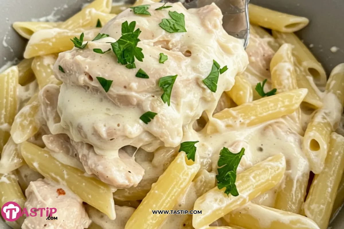 Return the cooked chicken and pasta to the skillet. Toss everything until it’s evenly coated in that glorious garlic parmesan sauce.